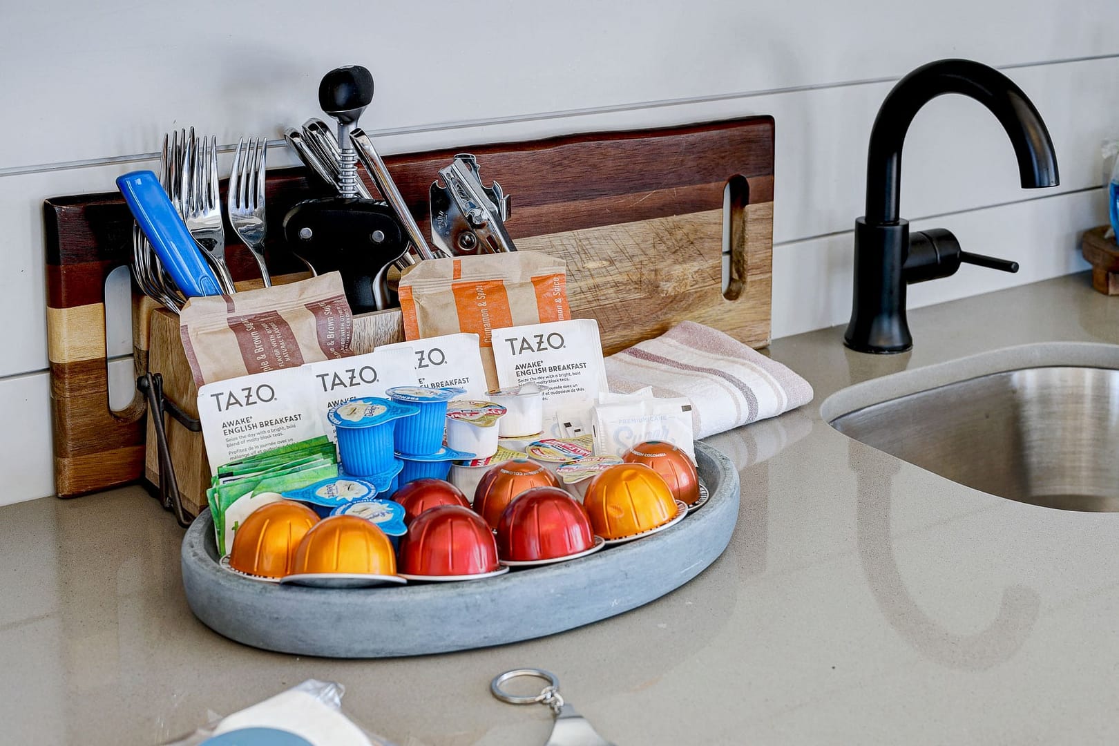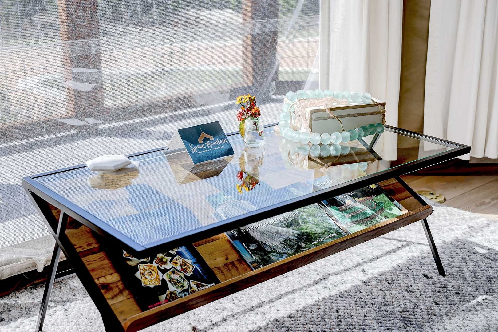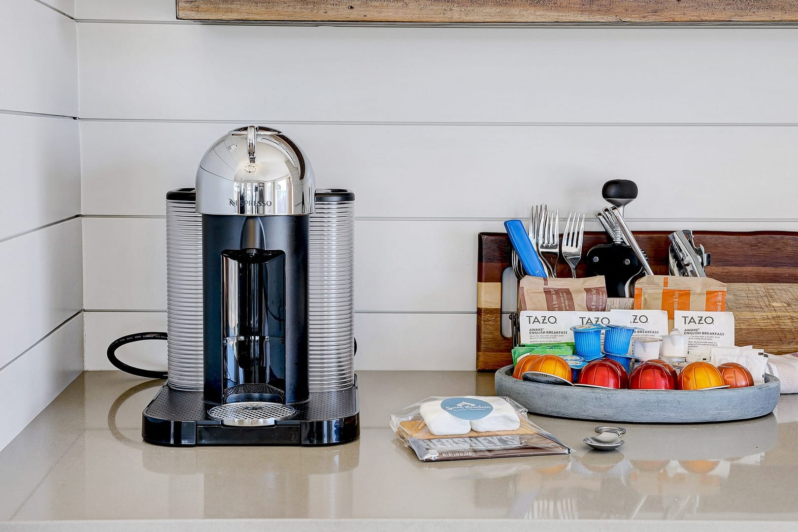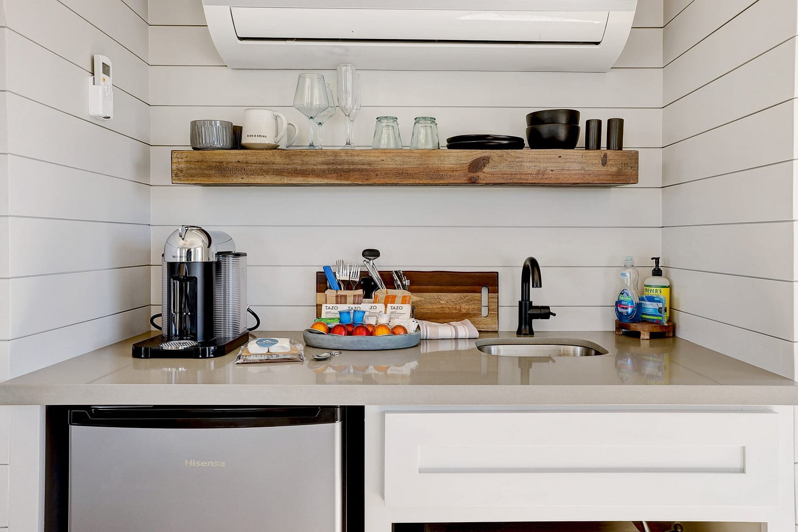Whether you’d like to brew coffee in the Nespresso coffee maker or snack on popcorn, the mini kitchenette makes it easily possible. The comfy seating area invites you to look out over the hills and listen to some tunes on Alexa while planning your day of adventures.