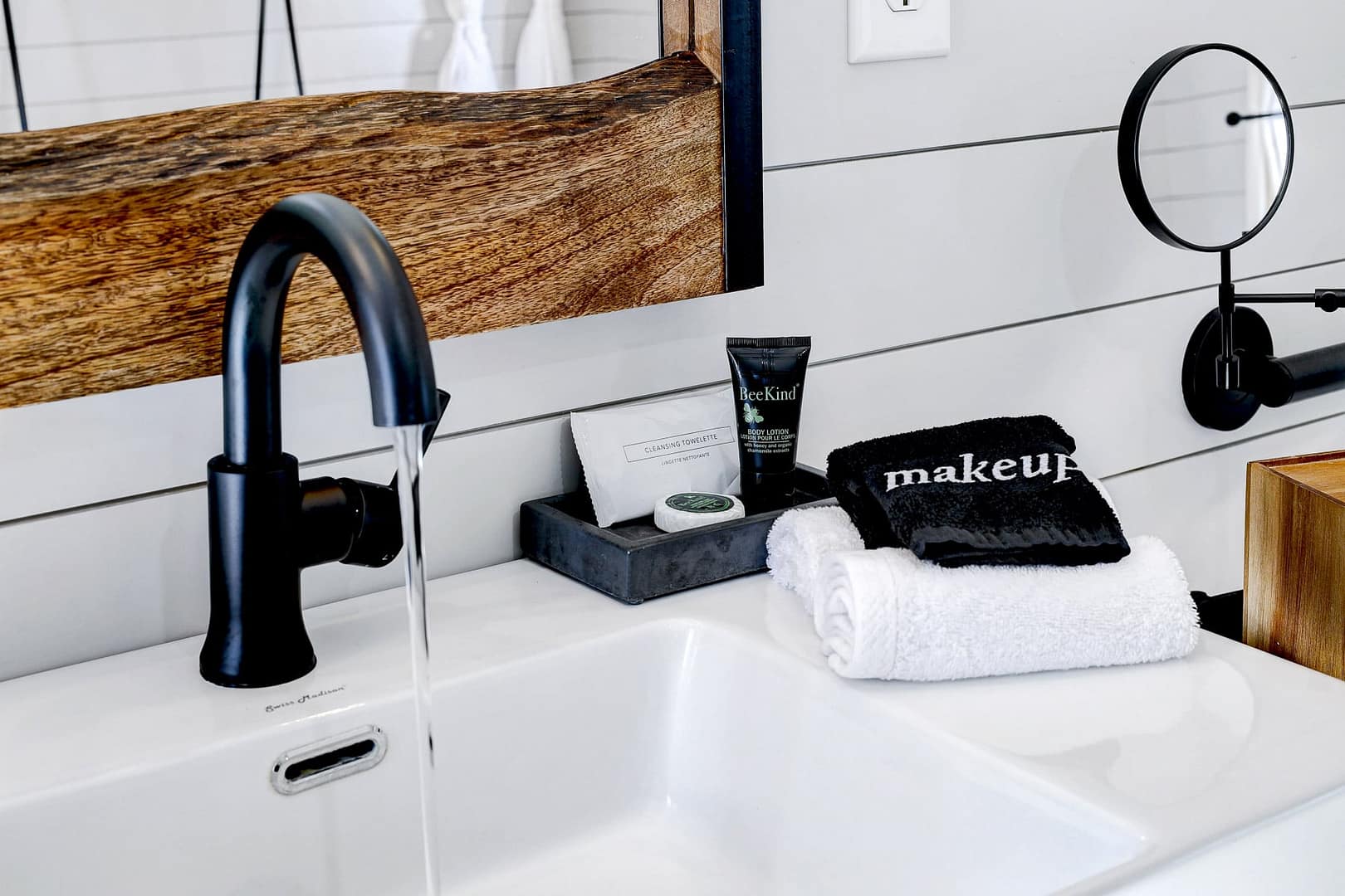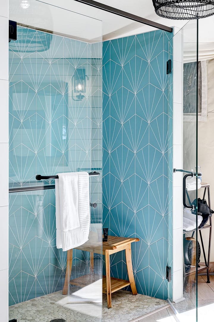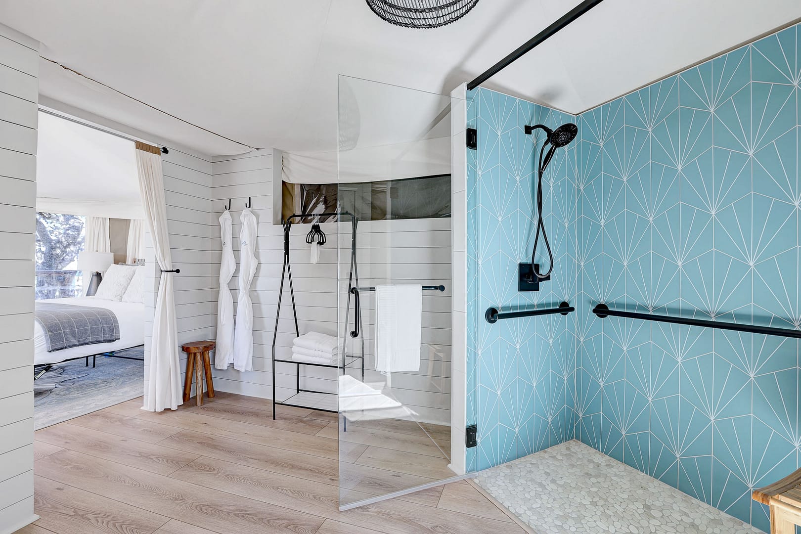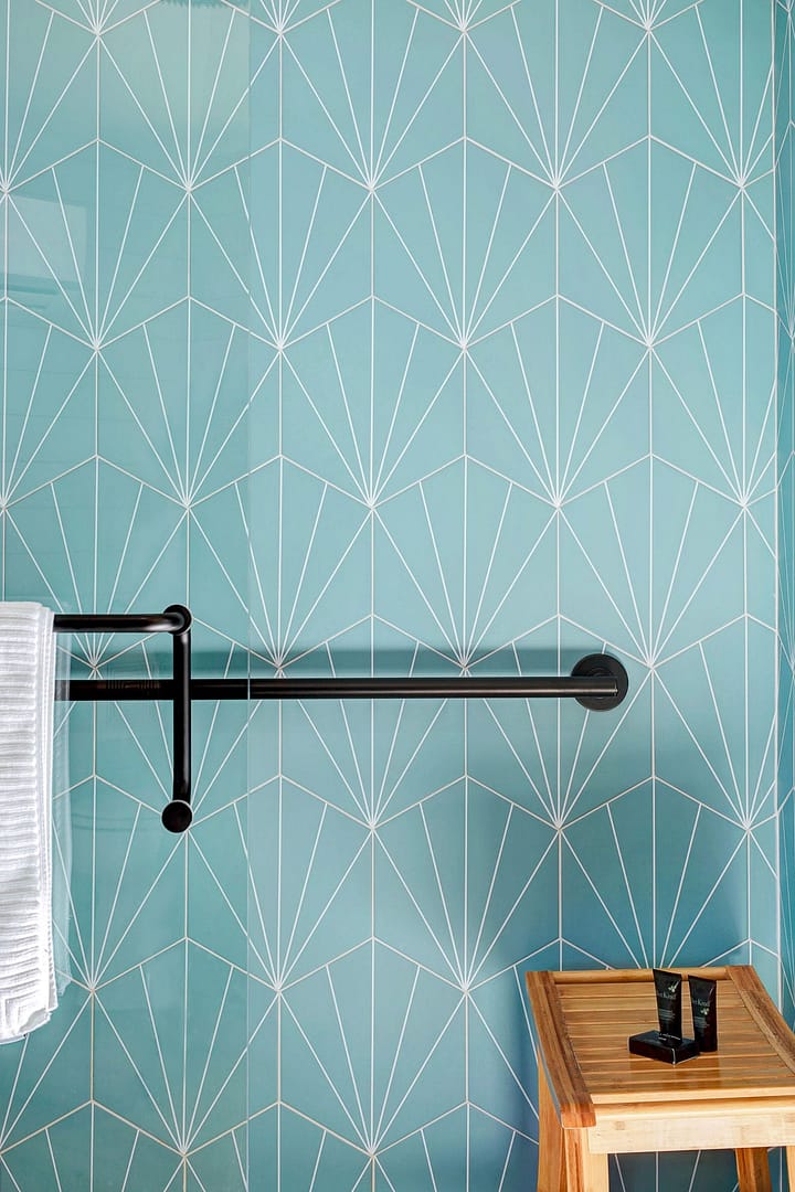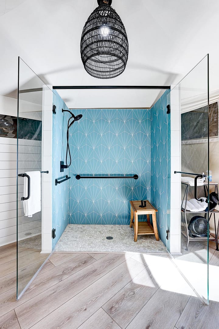 The large, luxurious bathroom includes a wheelchair-accessible shower with gorgeous tiling, Bee Kind brand toiletries and a Spoon Mountain robe for lounging.