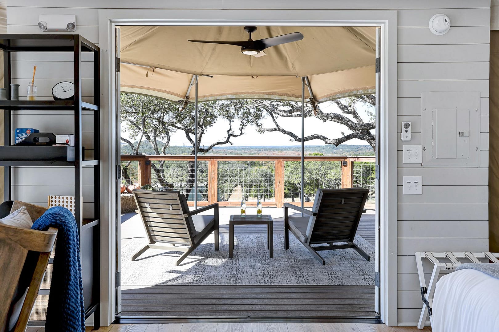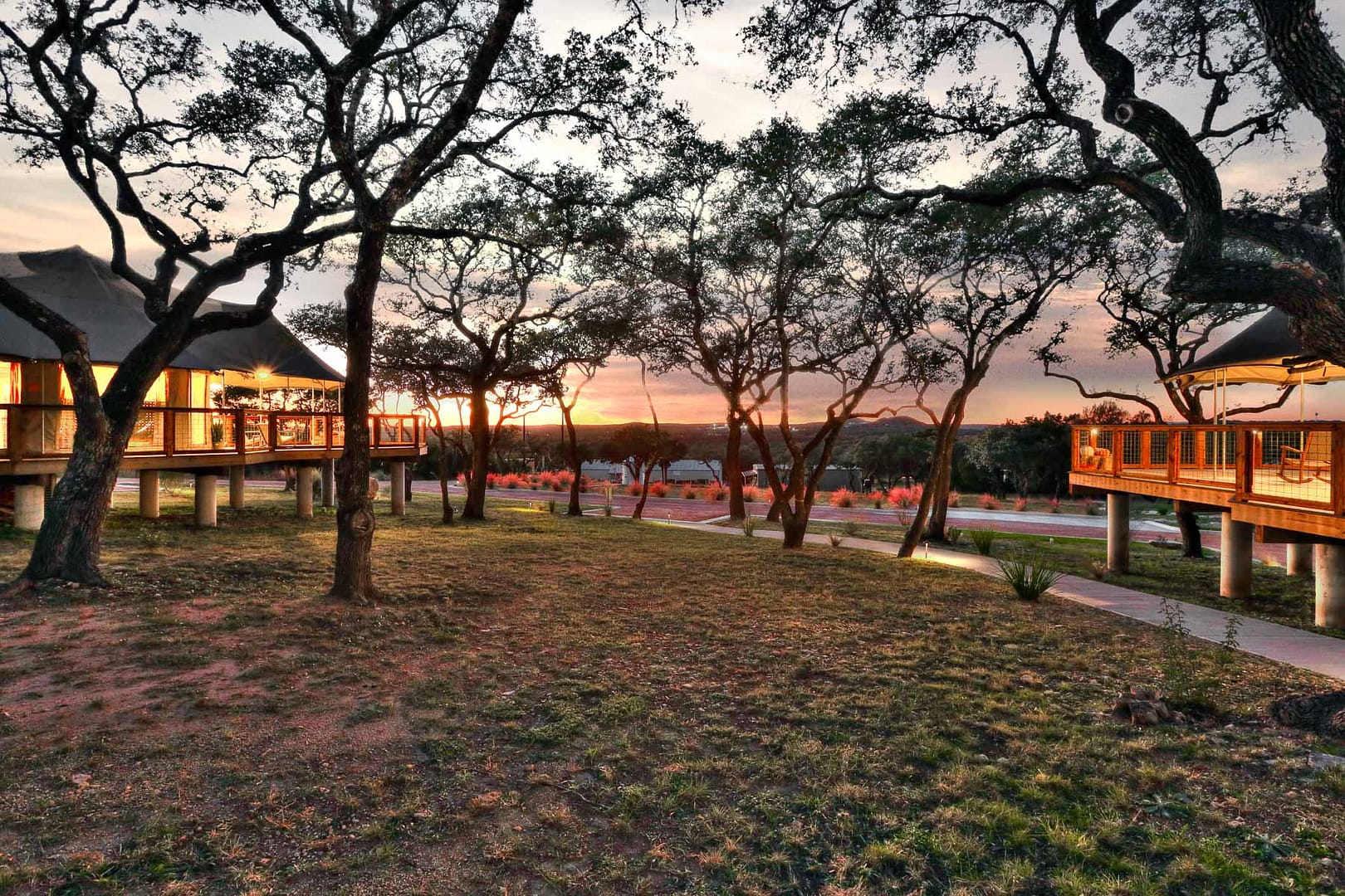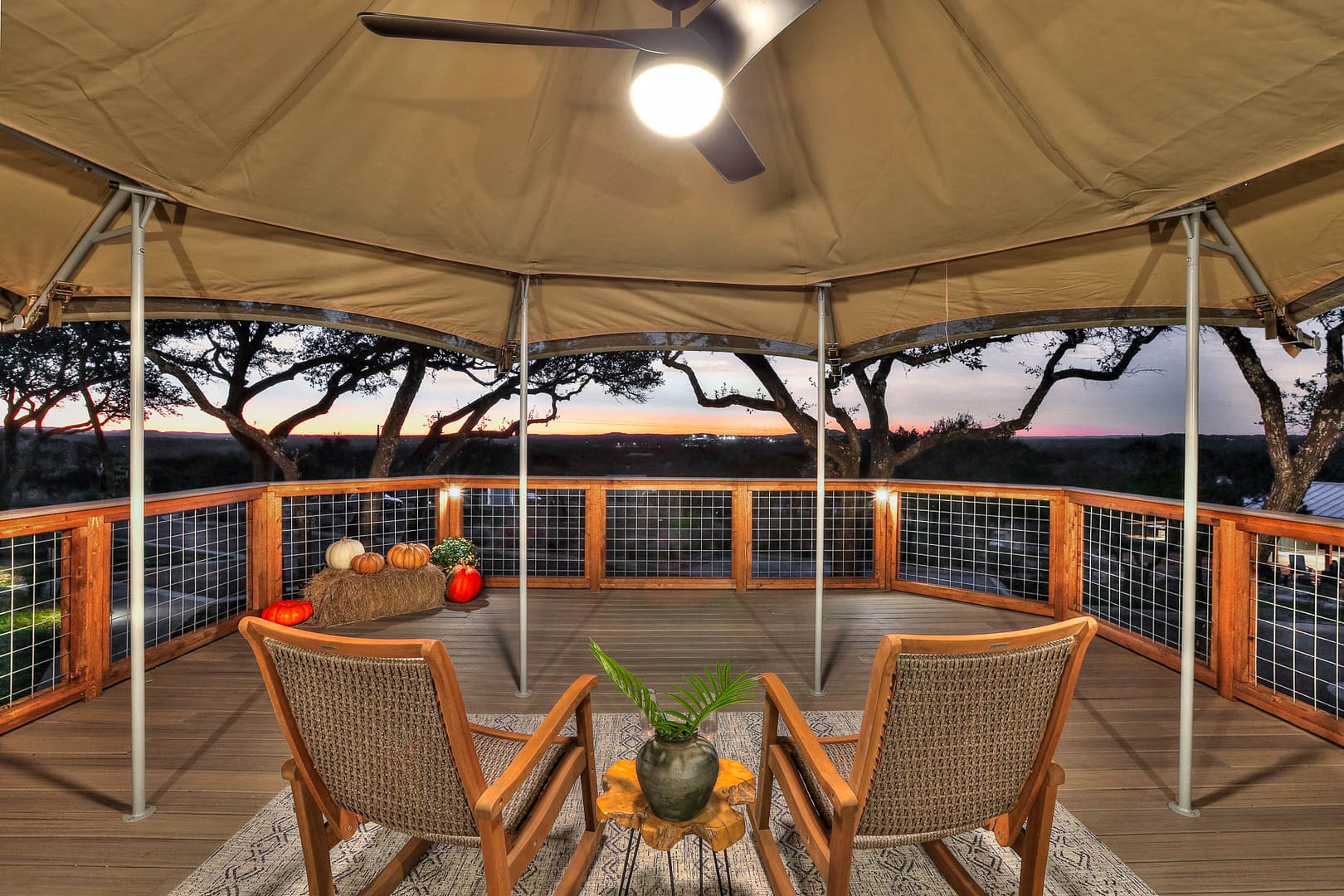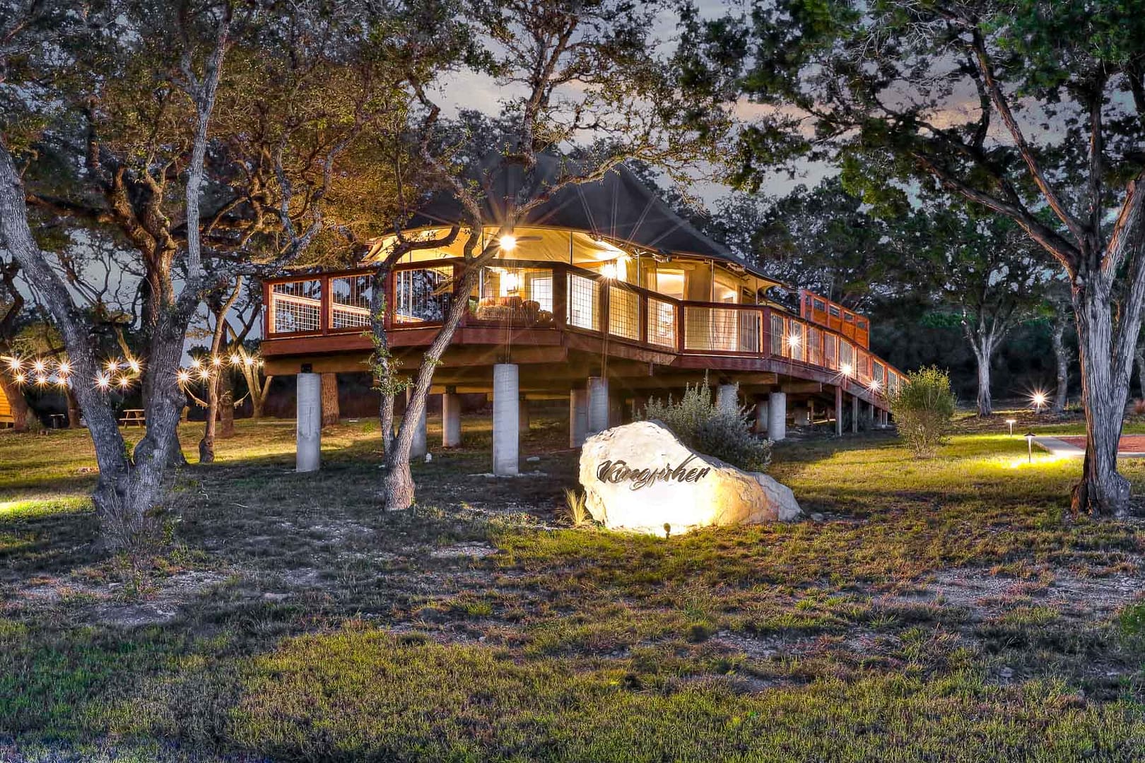Experience the magic of Hill Country Glamping from our African Safari tent, Kingfisher where you’ll have the perfect vantage point to enjoy panoramic views of the Wimberley Valley. Take in the sunset on the front deck or a dance behind an 8-foot tall privacy fence with a side of moonlight!